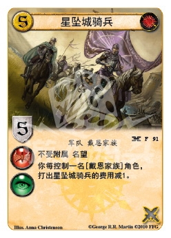 你每控制一名[戴恩家族]角色,打出星坠城骑兵的费用减1。